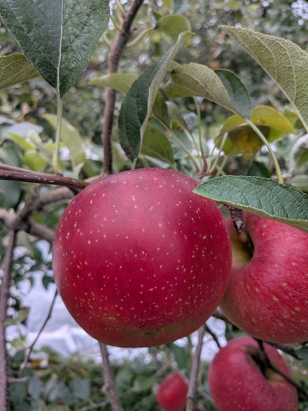 当園では、カープのように赤く染まった秋映(あきばえ)、ジョナゴールド、ゴールデンデリシャス、紅将軍、赤城(あかぎ)、シナノスィートが食べ頃です。